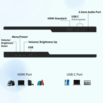 با HDMI، USB-A و USB-C (پشتیبانی از USB-C 3.1)، این نمایشگر به انواع دستگاهها از جمله لپتاپ، رایانههای شخصی، کنسولهای بازی مانند Xbox و PlayStation، Raspberry Pi، و تلفنهای هوشمند متصل میشود. همچنین، به عنوان نمایشگر برای مینی کامپیوترها و استریمهای خانگی، تجربهای چندجانبه و کارآمد ارائه میدهد. بلندگوهای داخلی استریو، صدا را بدون نیاز به تجهیزات خارجی ارائه میکنند.